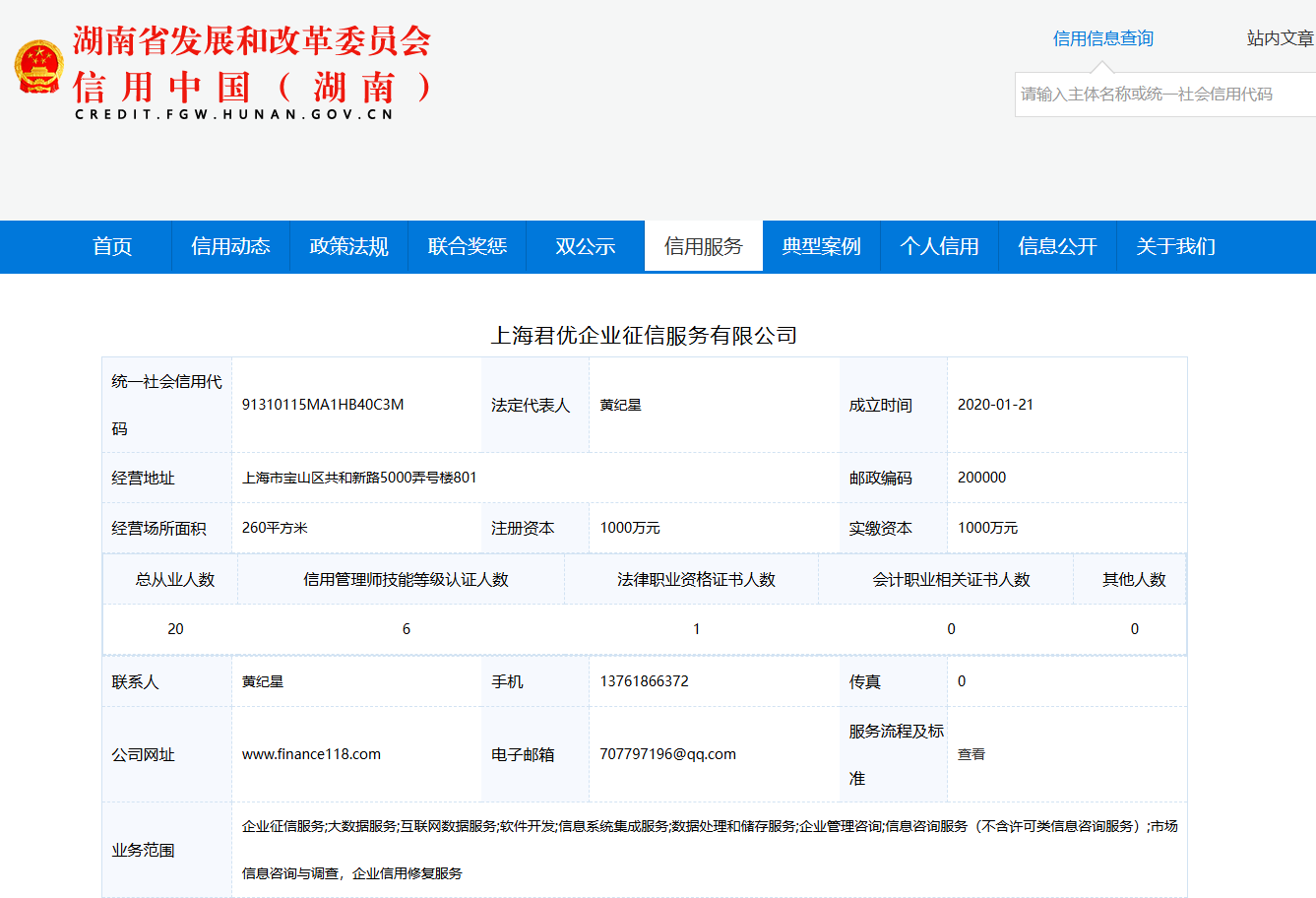 上海君优企业征信服务有限公司荣获湖南省发改委信用(中国)湖南备案公示